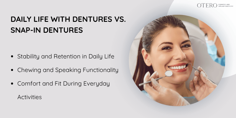 Traditional dentures and snap-in dentures feel completely different during normal activities. Regular dentures rely on suction and adhesive to stay in place, while snap-in dentures attach to dental implants for a more secure fit.