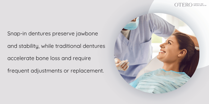 Traditional dentures need frequent adjustments as your jawbone shrinks. You may need new dentures every five to seven years. Snap-in dentures last longer because your jawbone stays more stable.