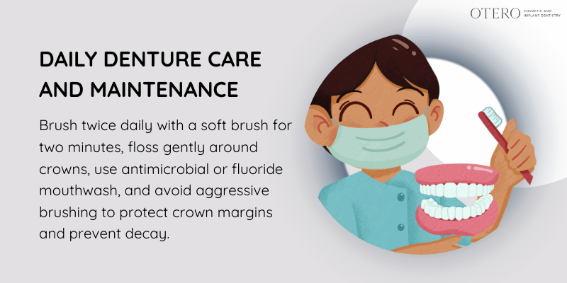 Daily oral hygiene directly protects crown margins where decay often starts. Brushing twice daily and flossing once removes plaque that builds up around your crown edges.